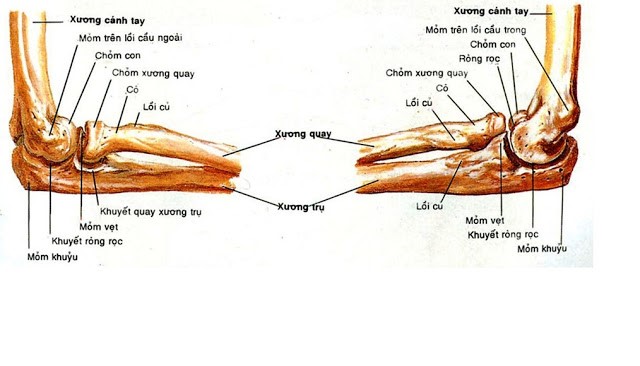 • Chỏm quay tiếp khớp với chỏm con của xương cánh tay và khuyết quay đầu trên xương trụ giúp cẳng tay gấp duỗi và sấp ngửa được.