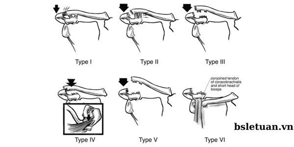 Độ VI: Đứt dây chằng cùng đòn, bao khớp và dây chằng quạ đòn, xương đòn di lệch xuống dưới rõ, bong diện bám của cơ delta và cơ thang vào đầu ngoài xương đòn. Hiếm gặp, có thể kèm tổn thương thần kinh.